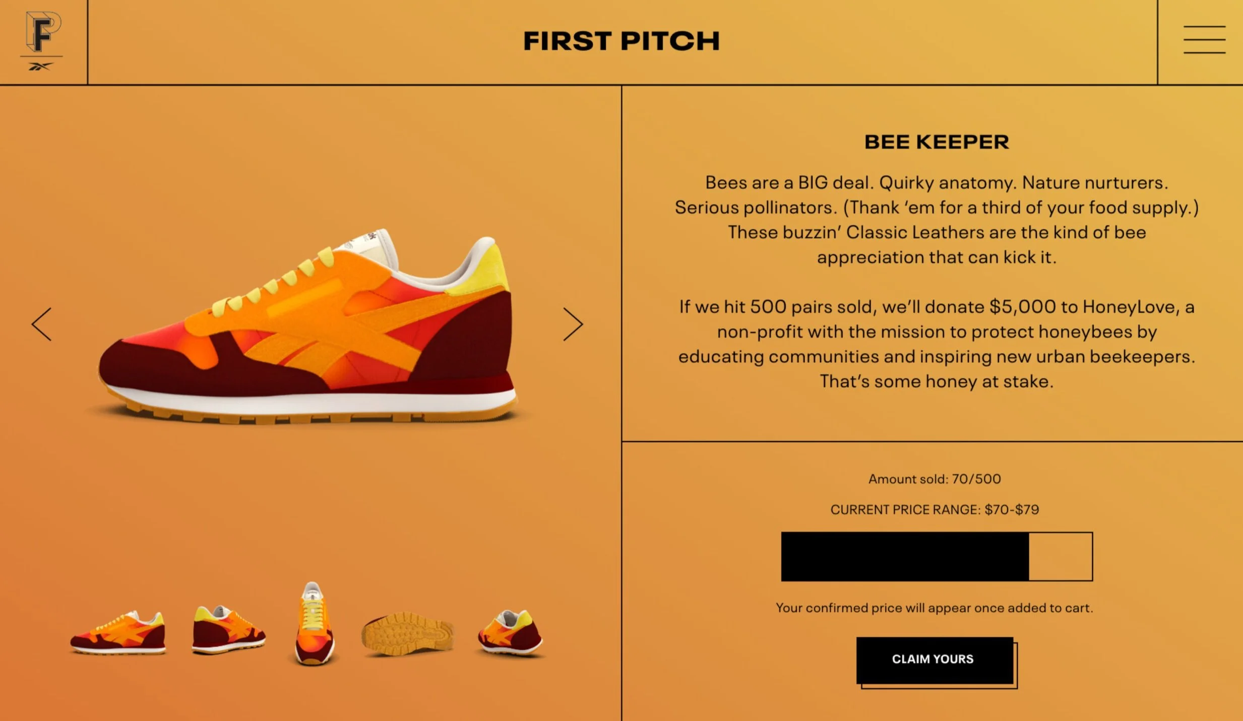 Inspired by the beauty and purpose of bees, the Bee Keeper is a limited-edition shoe born through First Pitch - where nothing gets made until 500 people commit.